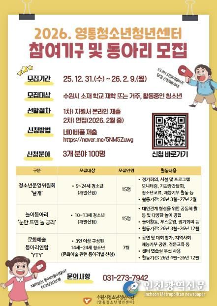 [인천광역신문] 박진 기자 | 수원시청소년청년재단 영통청소년청년센터가 2026년 활동에 함께할 청소년 참여기구 및 동아리 참가자를 모집한다. 모집 대상은 청소년운영위원회, 놀이동아리, 문화예술동아리연합 총 3개 분야이며, 선발 인원은 약 100명이다.