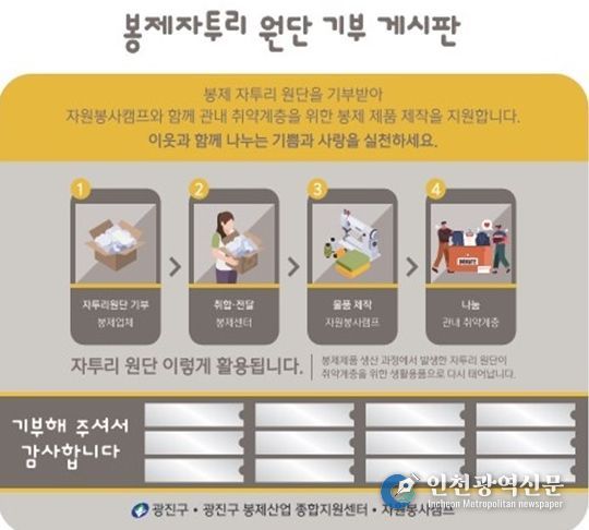 [인천광역신문] 박진 기자 | 광진구가 봉제 제품 생산 과정에서 발생하는 자투리 원단으로 생활용품을 만들어 취약계층을 지원하는 나눔 사업을 시행한다.