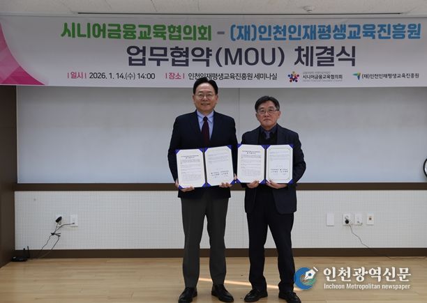 [인천광역신문] 박진 기자 | 인천인재평생교육진흥원과 시니어금융교육협의회은 14일 인천 시민의 평생교육 발전과 중·장년층 및 고령층의 안정적인 금융생활 지원을 위해 업무협약을 실시했다.