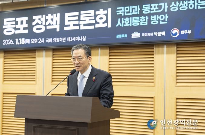 [인천광역신문] 박진 기자 | 법무부는 2026년 1월 15일(목) 오후 2시, 국회의원회관 제1세미나실에서 국회의원 박균택 의원실과 공동으로 '국민과 동포가 상생하는 사회통합'정책 토론회를 개최했다.