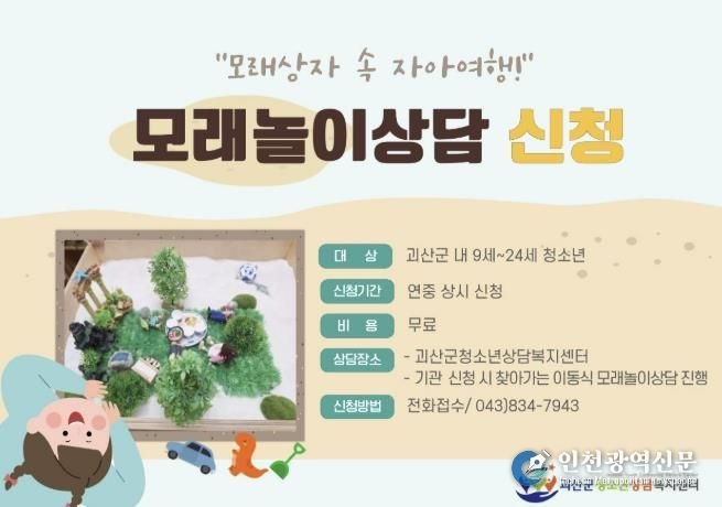 [인천광역신문] 박진 기자 | 충북 괴산군청소년상담복지센터는 ‘찾아가는 모래놀이상담’을 연중 운영한다고 16일 밝혔다.