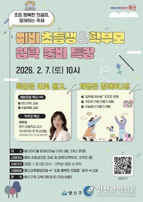 [인천광역신문] 박진 기자 | 서울 용산구는 오는 2월 7일 용산아트홀(녹사평대로 150)에서 예비 초등학생과 학부모를 위한 입학 준비 행사인 ‘초등 행복한 첫걸음, 함께하는 축제’를 개최한다.