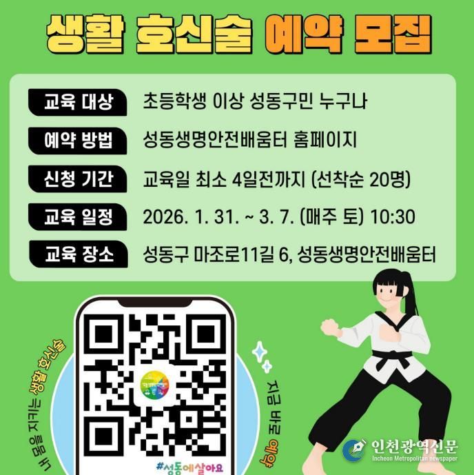 [인천광역신문] 박진 기자 | 서울 성동구가 구민의 생활 안전 역량 강화를 위해 성동생명안전배움터에서 ‘2026년 생활 호신술 안전교육’을 운영한다.