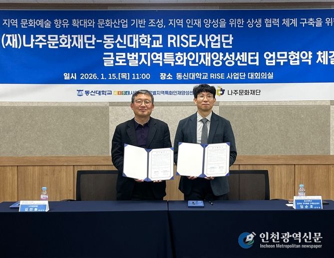 나주문화재단(이사장 윤병태)은 동신대학교 RISE사업단 글로벌지역특화인재양성센터(센터장 임순호)와 지난 15일 지역 문화예술 향유 확대와 문화산업 기반 조성, 청년 인재 양성을 위한 업무협약을 체결했다고 16일 밝혔다.