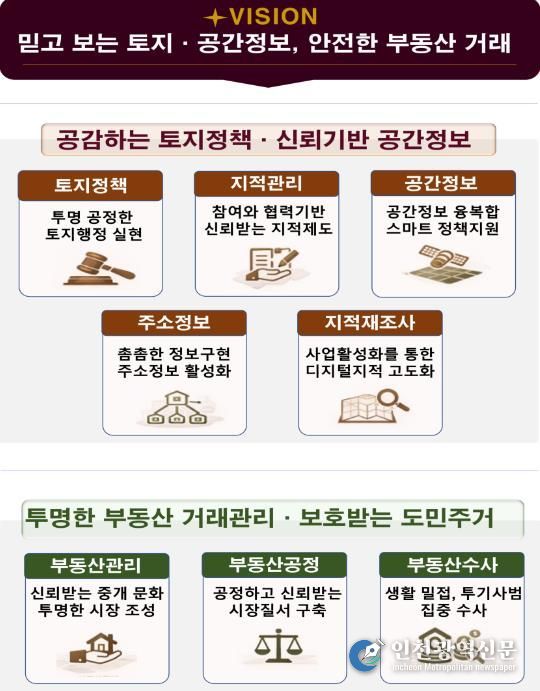 추진계획은 ▲투명하고 균형 잡힌 제도 운영으로 신뢰받는 토지행정 실현 ▲참여와 협력을 통한 신뢰받는 지적제도 정착 ▲공간정보 융·복합을 통한 스마트한 정책 지원 ▲촘촘한 주소정보 구현 및 주소정보 활성화 추진 ▲사업활성화를 통한 디지털지적 고도화 ▲신뢰받는 중개 문화와 투명한 부동산 시장 조성 ▲공정하고 신뢰받는 시장질서 구축 ▲생활밀접, 투기사범 집중수사 등 8대 전략을 바탕으로 한 92개 세부 이행과제로 구성됐다.
