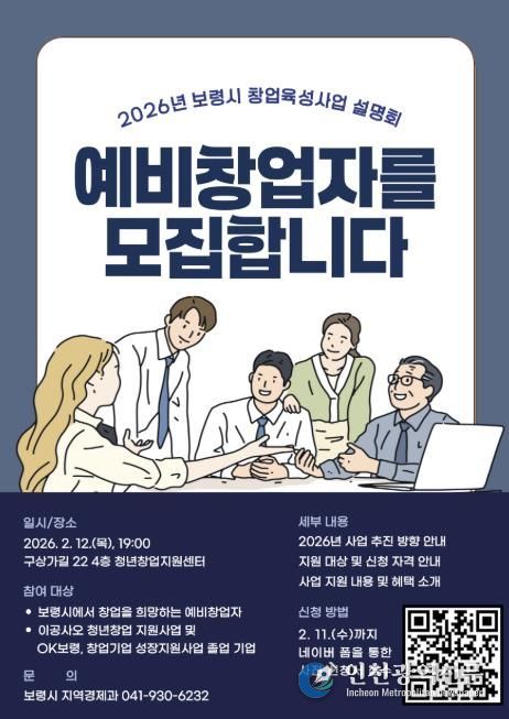 [인천광역신문] 박진 기자 | 보령시는 오는 2월 12일 오후 7시 청년창업지원센터에서 예비창업자 및 창업기업을 대상으로 ‘2026년 창업육성사업 설명회’를 개최한다.