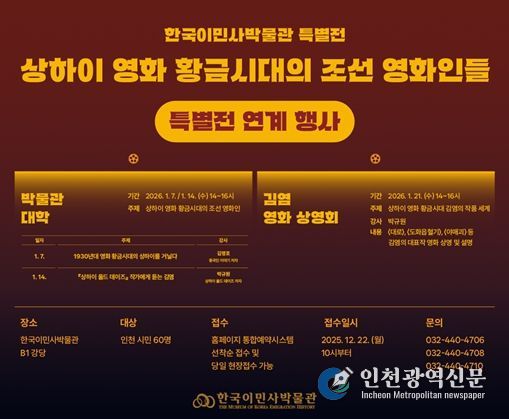 [인천광역신문] 박진 기자 | 인천광역시 시립박물관 분관 한국이민사박물관은 특별전 〈상하이 영화 황금시대의 조선 영화인들〉과 연계해 중국 영화 황제로 불렸던 배우 김염(金焰)의 대표 영화 작품 상영회를 개최한다.