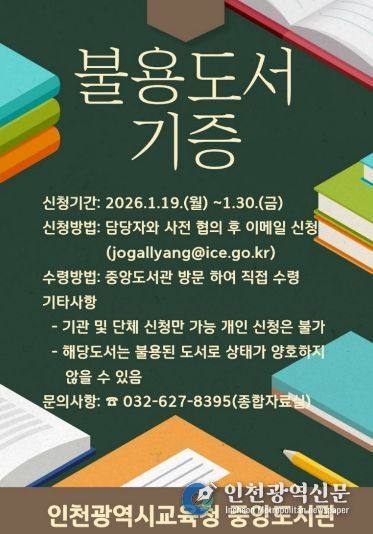 [인천광역신문] 박진 기자 | 인천광역시교육청중앙도서관은 지역사회 내 도서 나눔 문화를 확산하고 지식 자원의 선순환을 실천하기 위해 ‘불용도서 기관 나눔’ 사업을 운영한다.