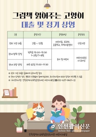 [인천광역신문] 박진 기자 | 인천광역시교육청중앙도서관은 그림책 스트리밍 서비스'그림책 읽어주는 고양이'를 2월부터 관내 희망 기관에 대출한다