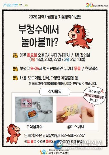 [인천광역신문] 박진 기자 | 부평구 청소년수련관은 오는 20일부터 다음달 10일까지 겨울방학을 맞아 지역 청소년을 위한 2026 지역사회활동 겨울방학 이벤트 ‘부청수에서 놀아볼까’를 진행한다.