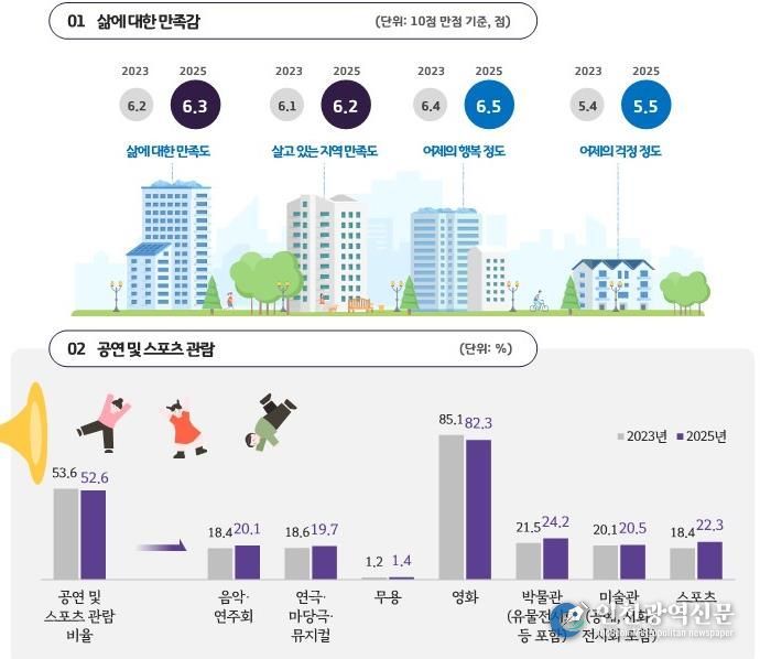 이번 결과는 2021년부터 2025년까지 삶의 만족·행복감, 여가·문화·관광 참여, 생활·안전 인식, 경제 체감 전반에서 완만하지만 일관된 개선 흐름을 보이는 점이 특징이다.