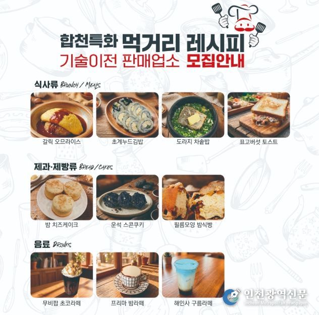 [인천광역신문] 박진 기자 | 합천군은 지역 특산물을 활용한 차별화된 먹거리를 보급하고 관광객들에게 풍성한 미식 경험을 선사하기 위해 ‘합천특화 먹거리 레시피 기술이전 및 판매업소’를 2026년 1월 19일 월요일부터 2월 20일 금요일까지 모집한다고 밝혔다.