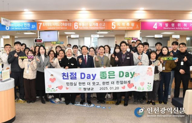 [인천광역신문] 박진 기자 | 창녕군은 1월 20일 민원봉사과 전 직원을 대상으로 ‘친절․청렴 다짐 데이’를 실시하고 군민에게 신뢰받는 행정서비스 제공을 위한 친절 실천 의지를 재확인했다.