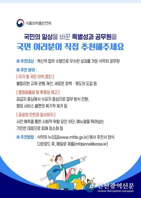 [인천광역신문] 박진 기자 | 식품의약품안전처는 국민이 체감하는 탁월한 성과를 창출한 공무원을 국민이 직접 추천해 포상하는 ‘국민추천제’를 1월 20일부터 운영한다고 밝혔다.