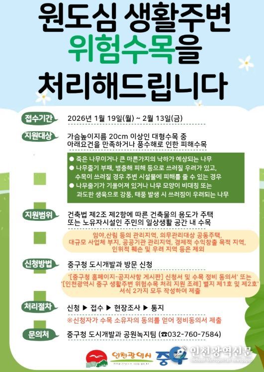 [인천광역신문] 박진 기자 | 인천시 중구는 원도심 권역을 대상으로 ‘2026년도 원도심 생활 주변 위험 수목 처리지원 사업’을 추진한다고 21일 밝혔다.