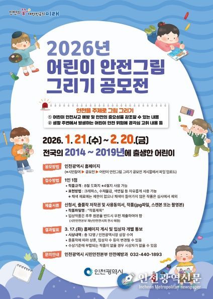 [인천광역신문] 박진 기자 | 인천광역시는 어린이들의 안전의식을 높이고 생활 속 안전문화 확산을 위해 '2026년 어린이 안전그림 그리기 공모전'을 개최한다고 밝혔다.