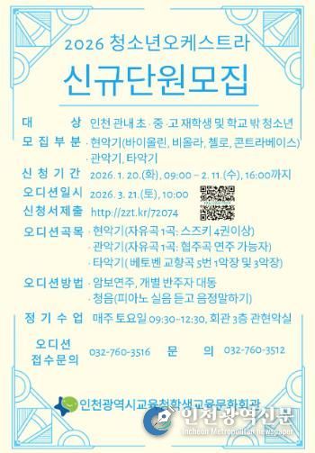 [인천광역신문] 박진 기자 | 인천광역시교육청학생교육문화회관은 3월 21일 ‘2026학년도 청소년오케스트라 단원 모집 오디션’을 실시한다.