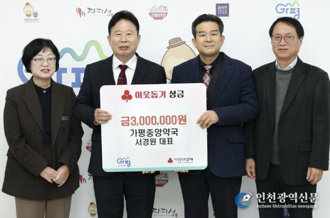 [인천광역신문] 박진 기자 | 가평중앙약국 서경원 대표는 21일 이웃돕기 성금 300만원을 가평군에 기탁하며 지역사회 나눔 실천에 동참했다.