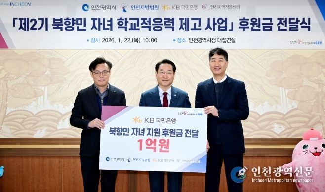 [인천광역신문] 박진 기자 | 인천광역시는 북향민 자녀의 학교 적응력 향상을 위한 '북향민 자녀 학교적응력 제고 제2기 사업' 추진을 위해 1월 22일 후원금 전달식을 개최하고, 국민은행으로부터 후원금 1억 원을 전달받았다고 밝혔다.