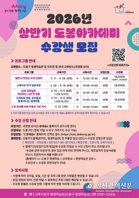 [인천광역신문] 박진 기자 | 서울 도봉구가 올해 상반기 ‘도봉아카데미’ 교육과정을 구 누리집에 공개했다.