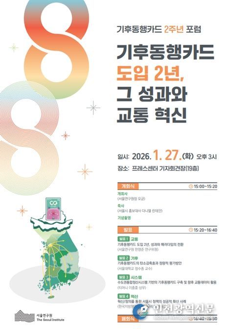 [인천광역신문] 박진 기자 | 서울연구원은 27일 오후 3시, 한국프레스센터 기자회견장에서 '기후동행카드 도입 2년, 그 성과와 교통 혁신'을 주제로 기후동행카드 2주년 정책 포럼을 개최한다.