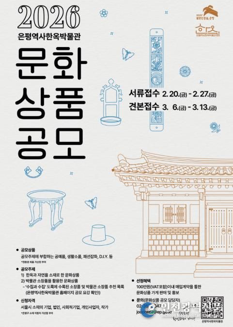 [인천광역신문] 박진 기자 | 서울 은평구는 오는 2월 20일부터 ‘2026 은평역사한옥박물관 문화상품 공모전’을 개최한다고 밝혔다.