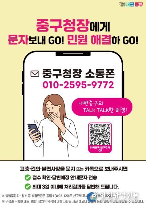 김길성 중구청장은 "구청장 소통폰은 주민 일상과 행정을 가장 빠르고 간편하게 잇는 연결선"이라며 "민원은 한 번 해결하면 끝이라는 안일함에서 벗어나 능동적인 소통으로 주민 일상을 언제나 챙기는 내편중구를 실현하겠다"고 말했다.