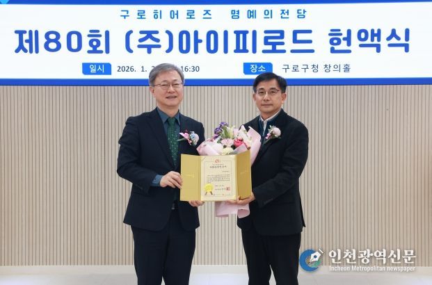 이날 장 구청장은 구청 창의홀에서 ㈜아이피로드(대표 강철지)에게 사회공헌 인증서를 전달하고, 본관 1층 명예의 전당에 제80호 구로히어로즈 명패를 등재했다.
