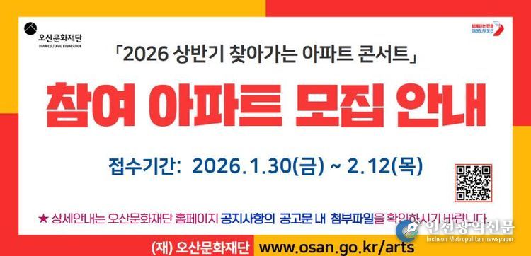 [인천광역신문] 박진 기자 | (재)오산문화재단은 2026년 찾아가는 문화나눔 사업의 일환으로 추진되는 '2026 상반기 찾아가는 아파트 콘서트' 지원 사업에 참여할 오산시 관내 아파트를 모집한다고 밝혔다.