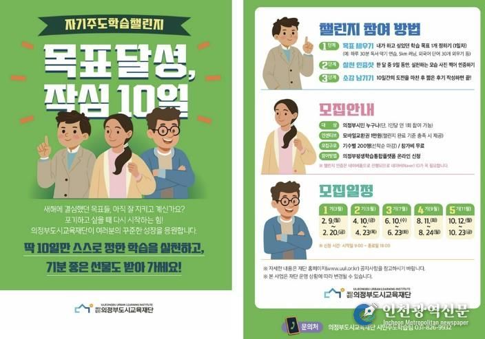 [인천광역신문] 박진 기자 | 의정부도시교육재단은 의정부 시민대학 ‘도전실험실’의 핵심 프로그램으로 자기주도학습챌린지 ‘목표달성, 작심 10일’을 운영한다고 밝혔다.