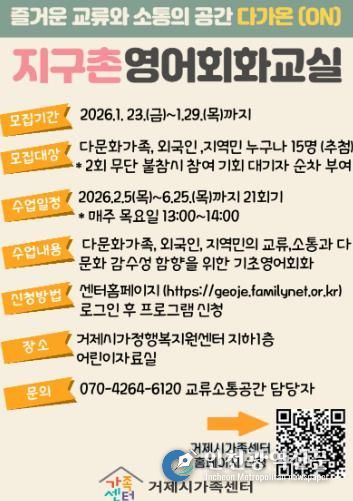 지구촌 영어회화교실 신청은 거제시가족센터 홈페이지를 통해 1월 29일까지 가능하며 관내 다문화가족, 외국인, 지역민이면 누구나 참여할 수 있다.