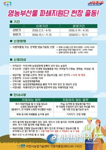 신청 대상은 농업경영체에 등록된 농업인이며, 신청 기간은 4월 10일까지이다. 신청은 이천시농업기술센터 영농기술팀 또는 식량작물팀으로 하면 된다. 현장 파쇄작업은 2월 19일부터 4월 30일까지 진행된다.