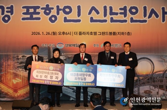 [인천광역신문] 박진 기자 | 지난 26일 서울 더 플라자호텔에서 열린 ‘2026년 재경 포항인 신년인사회’에서 재경 출향인들이 고향 발전을 염원하는 마음을 담아 고향사랑기부금을 기탁하며 뜨거운 고향 사랑을 실천했다.