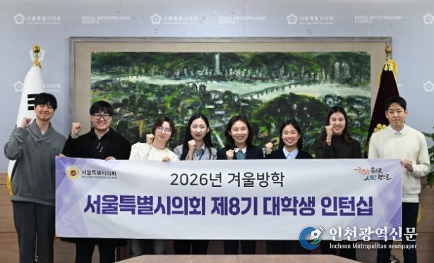 [인천광역신문] 관리자 기자 | 서울특별시의회 최호정 의장(국민의힘, 서초4)은 26일 의회 본관 의장접견실에서'제8기 겨울방학 대학생 인턴 간담회'를 개최하고, 청년들과 서울시 정책 현안, 일·가정 양립 고민 등을 주제로 진솔한 대화를 나눴다. 이번 간담회에는 대학생 인턴 7명이 참가했으며, 각자가 수행 중인 정책 연구 주제와 활동 소감을 공유했다.