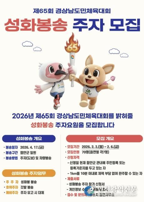 [인천광역신문] 관리자 기자 | 함안군은 제65회 경상남도민체육대회의 시작을 알릴 성화봉송 주자를 공개 모집한다고 28일 밝혔다.