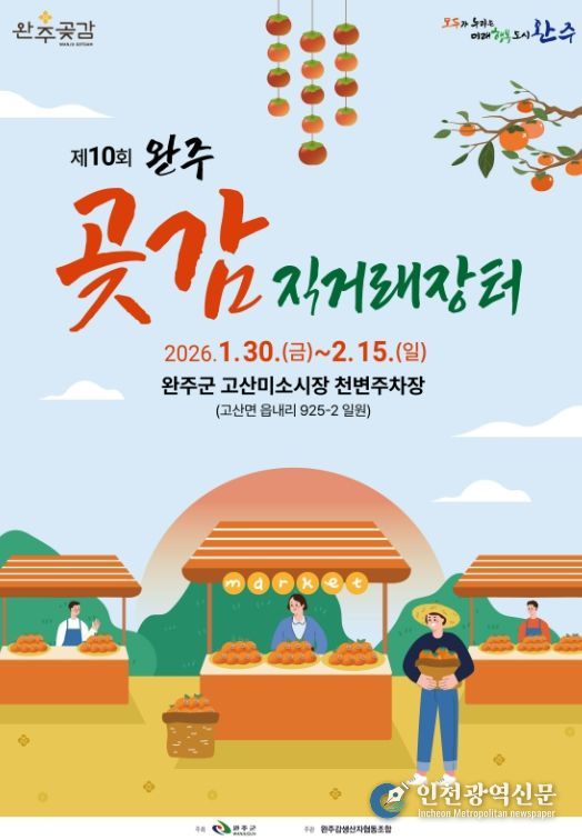 [인천광역신문] 관리자 기자 | 완주군이 설 명절을 앞두고 오는 30일부터 2월 15일까지 고산면 고산미소시장 천변주차장에서 제10회 완주곶감 직거래장터를 개최·운영한다.