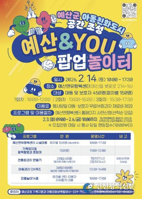 [인천광역신문] 관리자 기자 | 예산군은 아동친화도시 공간 조성의 하나로 아동과 가족이 함께 즐길 수 있는 ‘예산앤유(&YOU) 팝업(한시운영) 놀이터’를 2월 14일 예산앤유행복센터에서 운영한다고 밝혔다.