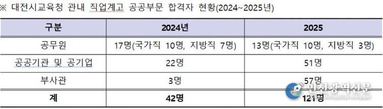 [인천광역신문] 관리자 기자 | 대전시교육청은 2025년 관내 직업계고 학생들의 공무원, 공공기관 및 공기업, 군부사관 합격 현황을 분석한 결과, 총 121명이 합격하며 전년 대비 비약적인 성장을 기록했다고 밝혔다.