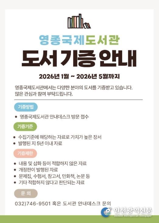 [인천광역신문] 관리자 기자 | 인천시 중구는 ‘주민과 함께 만드는 열린 도서관’ 실현 차원에서 올해 1월부터 ‘영종국제도서관 도서 기증 캠페인’을 추진하며, 주민들의 적극적인 관심과 참여를 당부했다고 29일 밝혔다.