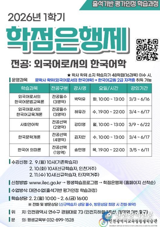 [인천광역신문] 관리자 기자 | 인천광역시교육청평생학습관은 2026년 1학기 학점은행제 학습자를 모집한다고 29일 밝혔다.