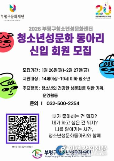 [인천광역신문] 관리자 기자 | 부평구청소년성문화센터는 다음 달 27일까지 ‘2026년 청소년성문화 동아리’ 신입 회원을 모집한다고 밝혔다.