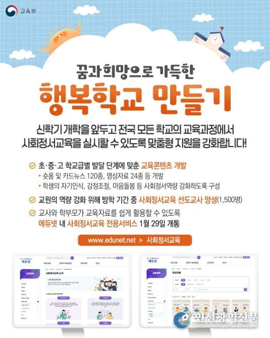 - 교사와 학부모가 교육자료를 쉽게 활용할 수 있도록 에듀넷 내 사회정서교육 전용서비스 1월 29일 개통