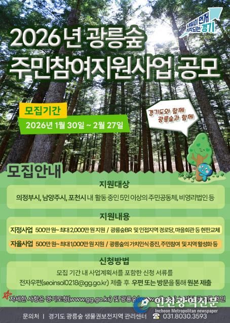 [인천광역신문] 관리자 기자 | 경기도가 광릉숲 생물권보전지역 활성화를 위해 2026년 광릉숲 주민참여지원사업 참여자를 모집한다.