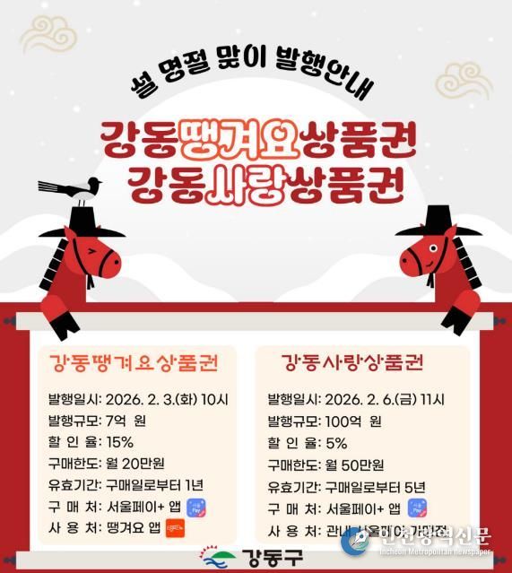 명절 이후에도 소비 회복 흐름이 이어질 수 있도록 강동땡겨요상품권은 3월과 4월에 각각 7억 원씩, 강동사랑상품권은 4월에 40억 원을 추가 발행할 계획이다. 두 상품권 모두 서울페이플러스 앱을 통해 구매할 수 있다.