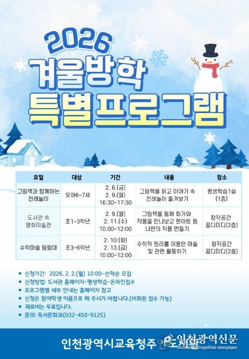 [인천광역신문] 관리자 기자 | 인천광역시교육청주안도서관은 관내 유·초등학생에게 다양한 평생학습 기회를 제공하기 위해 2월 6일부터 13일까지 ‘겨울방학 특별프로그램’을 운영한다.