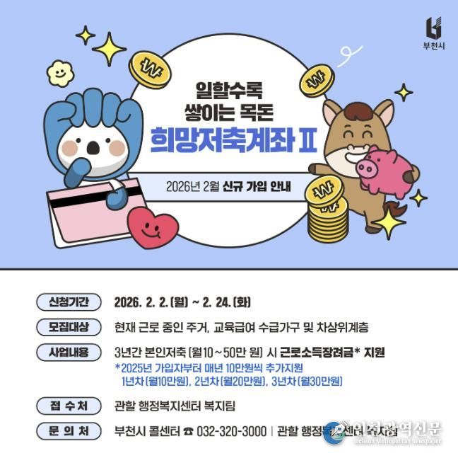 [인천광역신문] 관리자 기자 | 부천시는 근로 중인 주거․ 교육급여 수급 가구와 차상위계층의 자산 형성과 자립을 지원하기 위해 ‘2026년 희망저축계좌(Ⅱ)’ 신규 가입자를 오는 2월 2일부터 24일까지 모집한다고 30일 밝혔다.