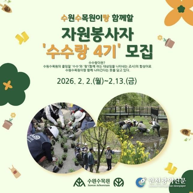 [인천광역신문] 관리자 기자 | 수원특례시는 수원수목원(일월·영흥수목원) 운영을 함께할 자원봉사자 ‘수수랑’ 4기 60명(일반 40명, 해설 20명)을 2월 2일부터 13일까지 모집한다.