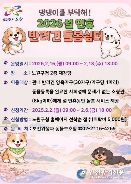 [인천광역신문] 관리자 기자 | 서울 노원구가 오는 2일부터 설 연휴 ‘반려견 돌봄쉼터’ 이용자를 모집한다고 밝혔다.