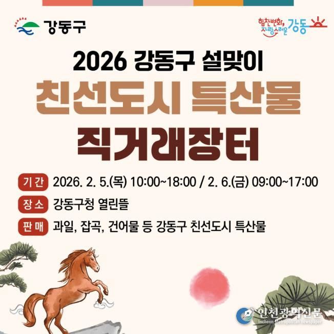 [인천광역신문] 관리자 기자 | 서울 강동구는 강동구 친선도시에서 생산된 우수 농·수·특산물을 한자리에서 만나볼 수 있는 ‘2026년 설맞이 친선도시 특산물 직거래장터’를 오는 2월 5일부터 6일까지 이틀간 강동구청 열린뜰에서 개최한다고 밝혔다.