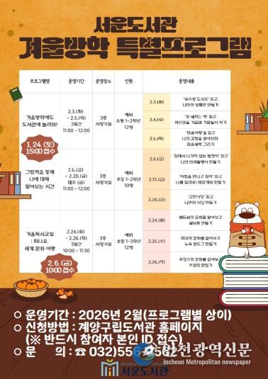 [인천광역신문] 관리자 기자 | 인천 계양구 서운도서관(관장 권문혁)은 2026년 겨울방학을 맞아 어린이를 위한 다양한 특강 프로그램을 운영한다.